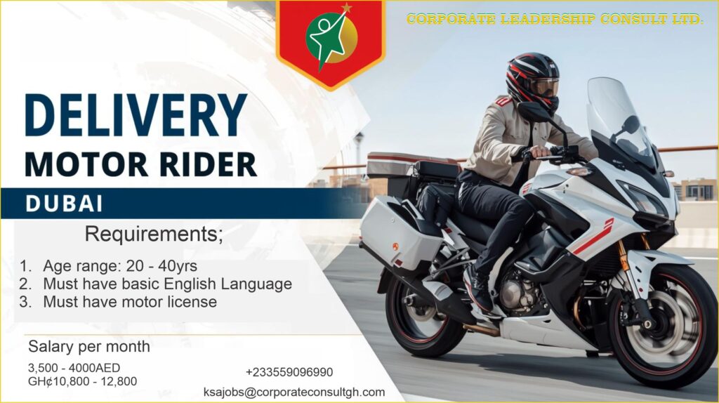 • Monthly salary: AED 3,500 – 4,000 (GH¢ 10,800 - 12,800)